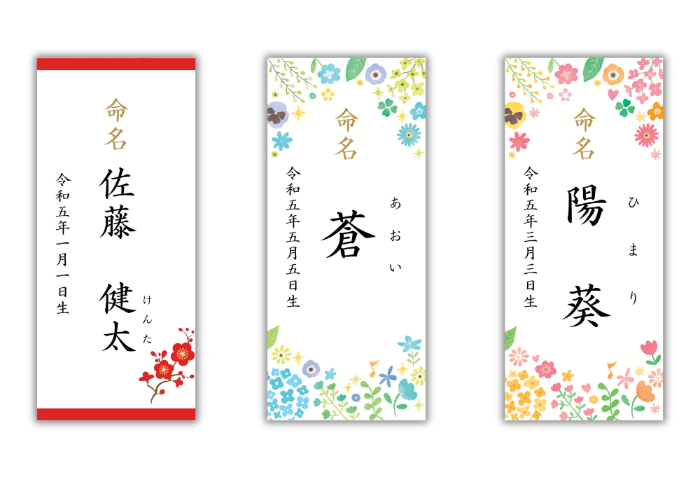 出産内祝いにそえて赤ちゃんのお名前をお披露目する命名札が一般的となっております。 当店では無料で命名札をご用意しております。