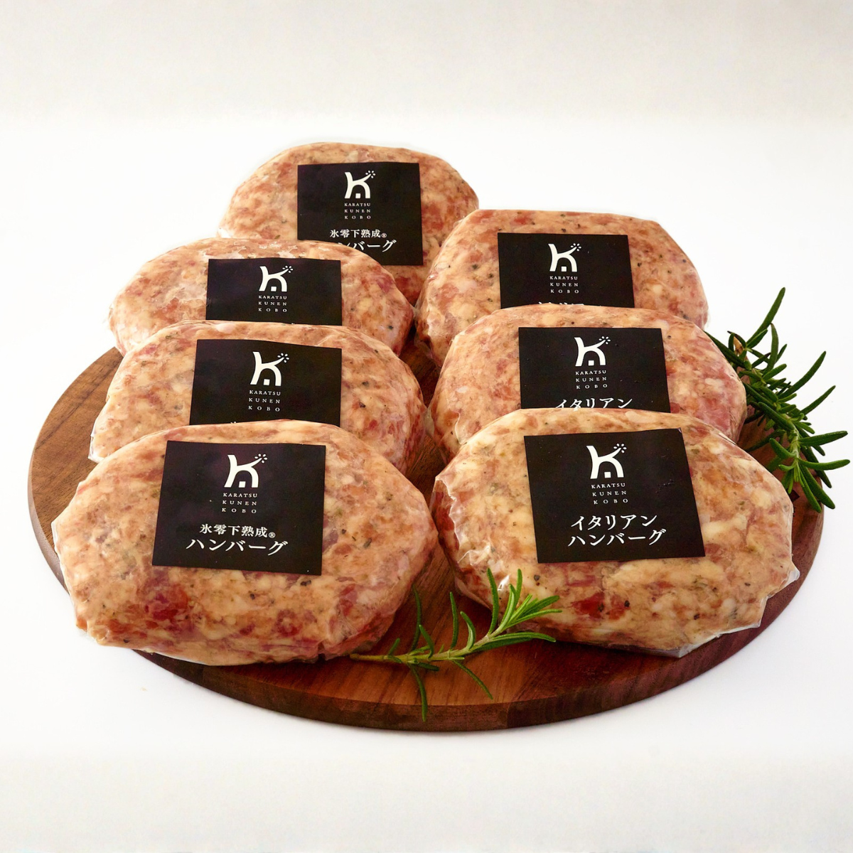 からくん自慢の2種のハンバーグを一度に楽しめる贅沢な食べ比べセット。 氷零下熟成ハンバーグは、独自の氷零下熟成技術で肉の旨みを引き出し、 ジューシーに仕上げた一品。 イタリアンハンバーグは、オレガノやローズマリーなどのハーブがふわりと香る サルシッチャ風の味付けで、シンプルながらも奥行きのある味わいに仕上げました。 ご家族での食べ比べや、ギフトにもぴったりなセットです。