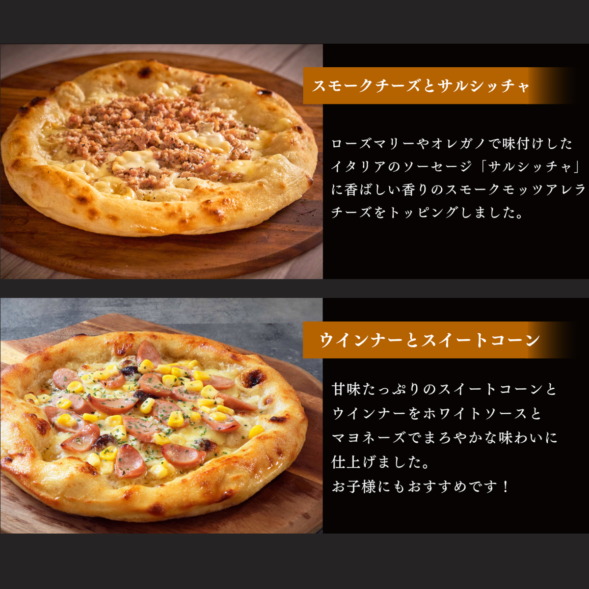 まるでピザ専門店!石窯焼きの本格ナポリ風ピザをご家庭で。 職人が手のばしで成形し、1枚ずつ石窯で焼き上げた、香ばしさともっちり食感が特長の本格ピザセット。 定番のマルゲリータからオリジナルの創作ピザなど8種類の中からお好きな3枚をセレクトしていただけます。