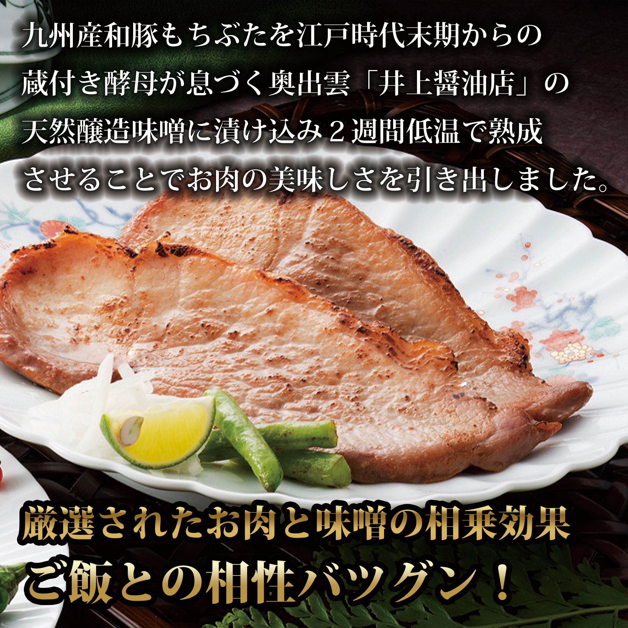 島根・奥出雲の老舗「井上醤油店」の天然醸造味噌を使用し、和豚もちぶたを丁寧に漬け込んだ特製味噌漬けポークセット。味噌本来のコクと自然な甘みが肉の旨みを引き立て、ごはんにも、お酒にもよく合う、奥深い味わいが特長です。真空パック入りで日持ちもよく、贈り物としても喜ばれる一品です。