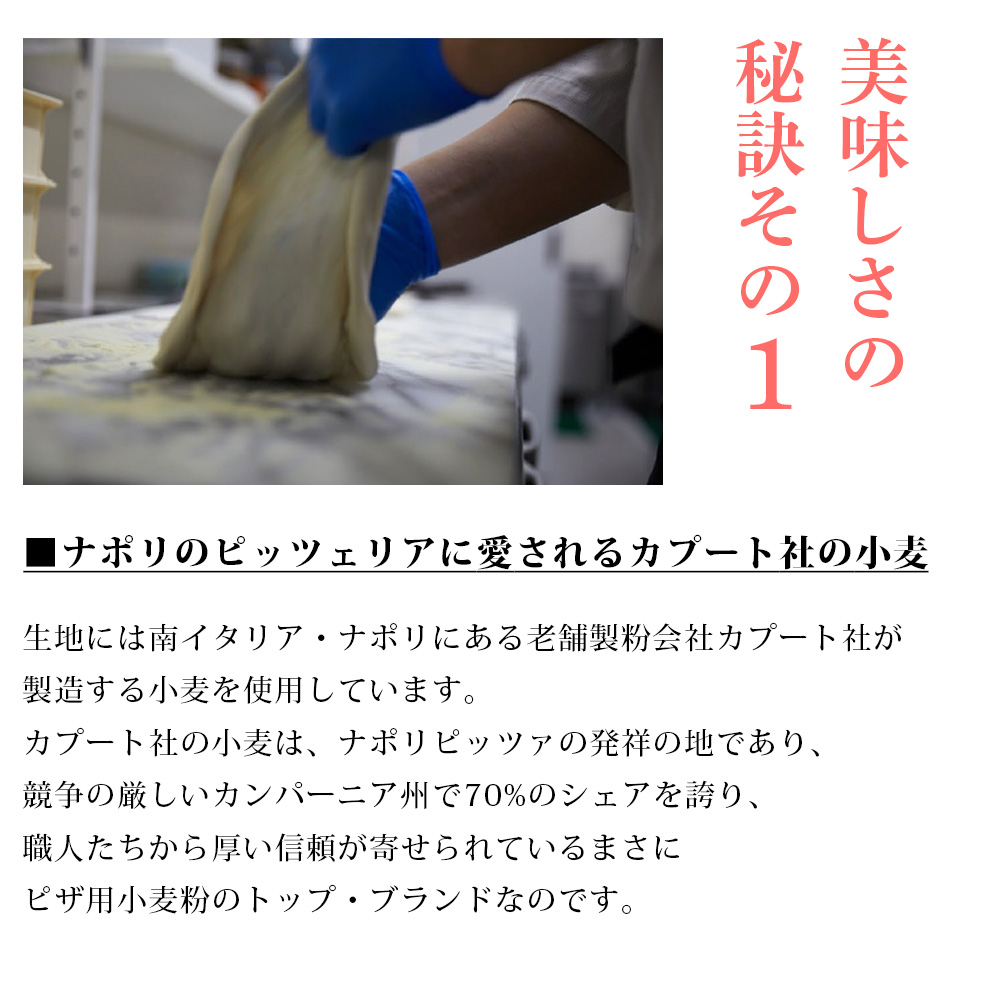 イタリア・ナポリの名門、カプート社のピザ専用粉を使用した自家製生地。