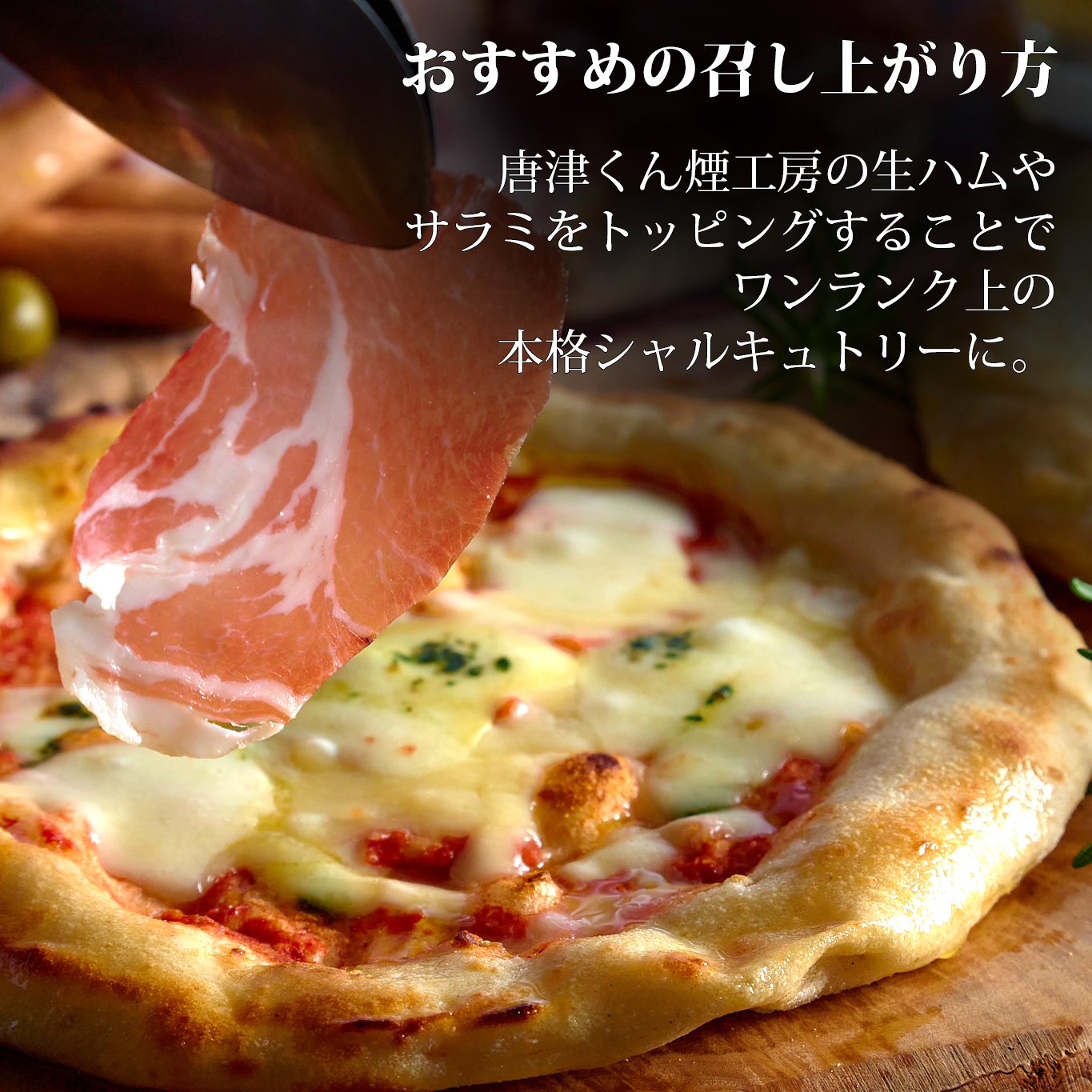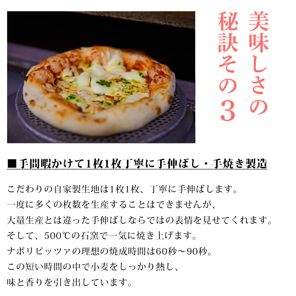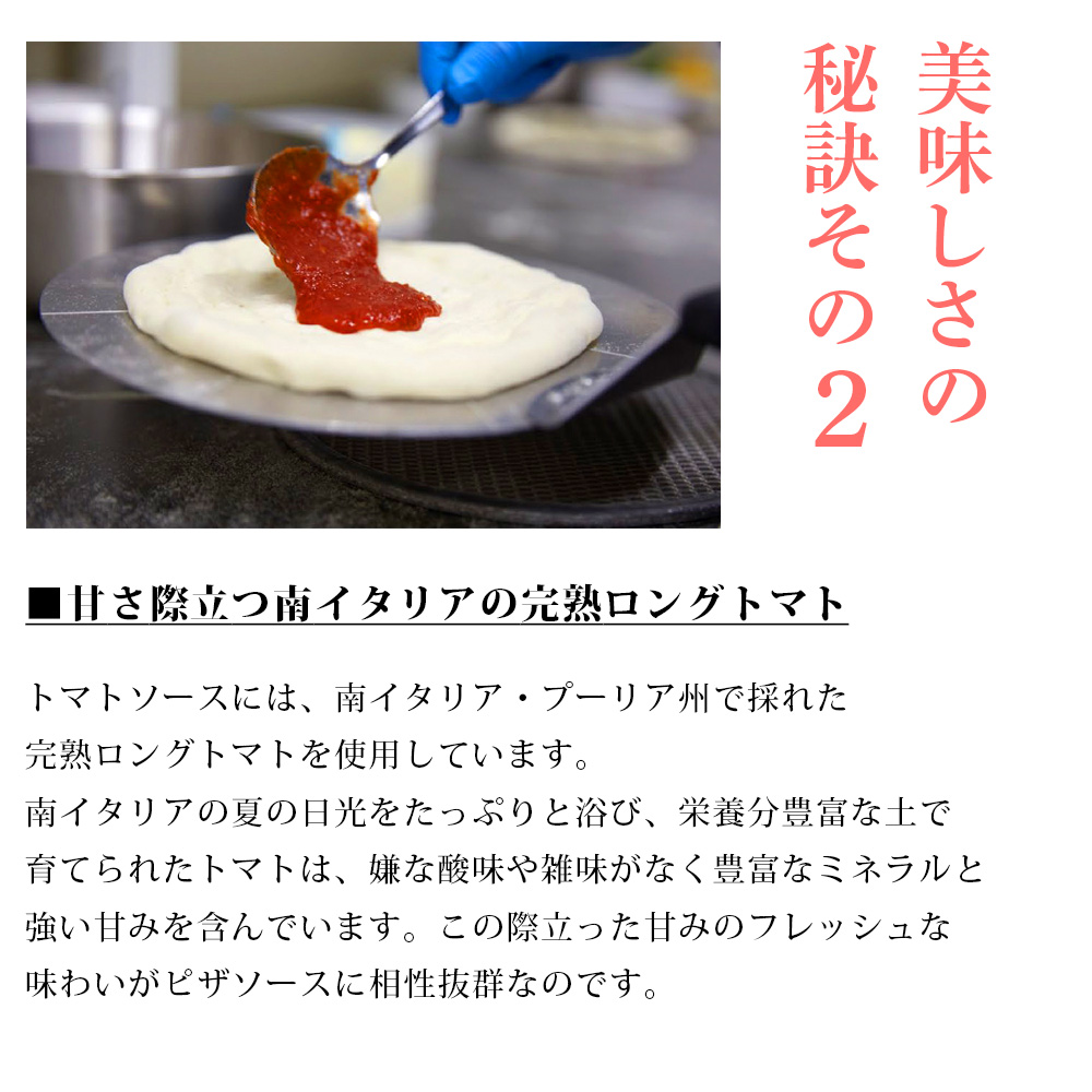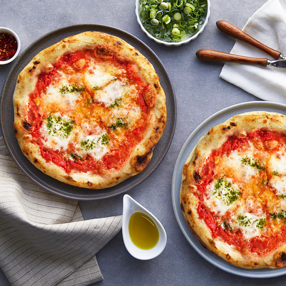 約500℃の石窯で一気に焼き上げることで、外は香ばしく中はもちもち。冷凍とは思えない食感を実現しました。南イタリア産完熟ロングトマトのソースと唐津産フレッシュバジル、ヨーロッパ産ナチュラルチーズを合わせた本格派。